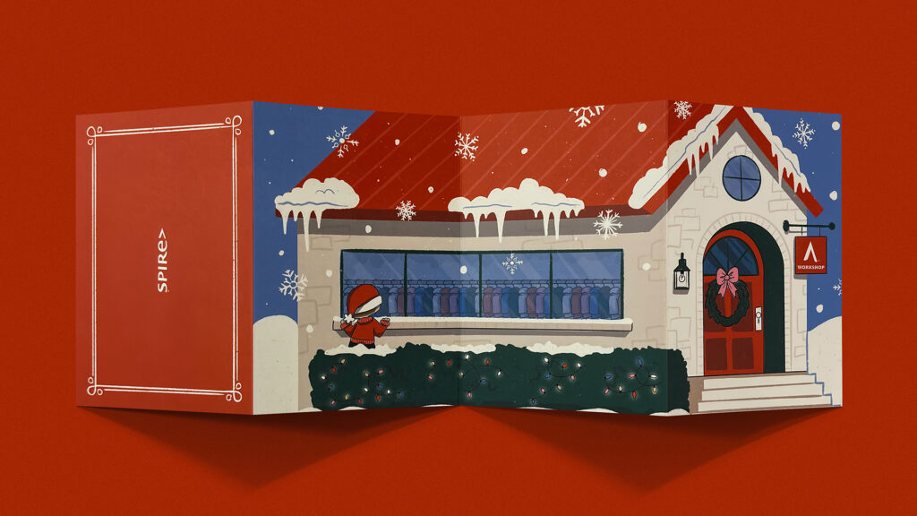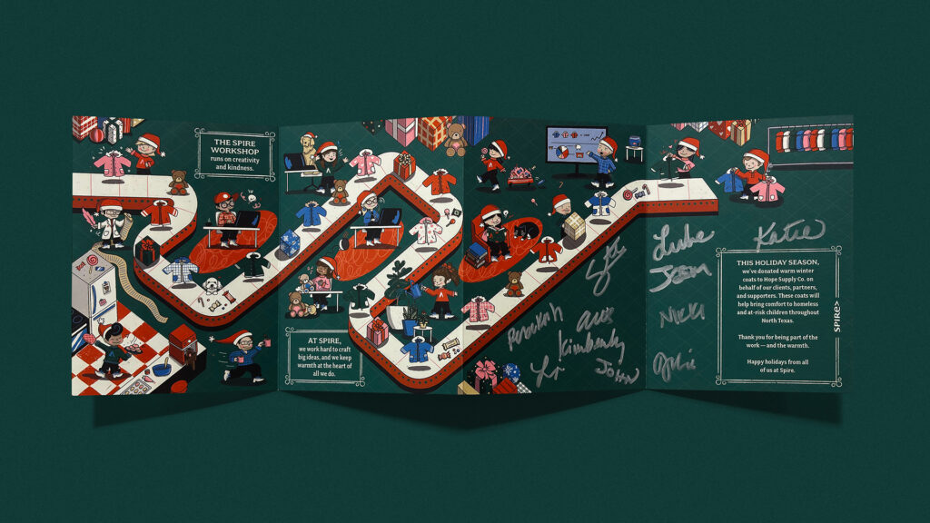 The four-panel “The Spire Workshop” 2025 holiday card brought the initiative to life through thoughtful, custom illustration. The front of the card depicts the exterior of the workshop with a subtle glimpse of coats inside, while the back reveals the workshop in full swing. Playful vignettes show Spire teammates doing what makes them unique: Jason carrying his daily two mugs of coffee, Luke presenting on how to make a warm coat, Katie editing a client podcast beside her space heater, and other fun team rituals. The holiday card was awarded two Honorable Mentions, one for Special Event Materials (Printed or Digital) and one for Illustration.