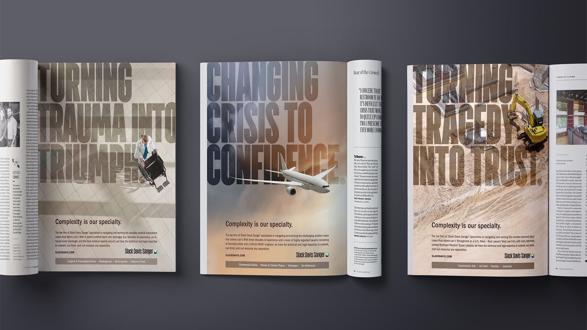To extend the refreshed brand beyond the website, we developed a multimedia campaign to elevate awareness and signal the firm’s range and depth. In a category crowded with generic attorney group shots in front of office buildings, these visuals broke the mold—strong, impactful, and instantly recognizable. From medical devices to construction sites to aircraft, the creative underscored SDS’s confidence and capabilities across multiple practice areas.